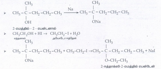13. எத்தனால் மற்றும் 2 - மெத்தில் பென்டன் - 2 - ஆல் ஆகியனவற்றிலிருந்து 2 - ஈத்தாக்ஸி - 2 - மெத்தில் ‘பென்டேனைத் தயாரிக்கும் வில்லியம்சனின் தொகுப்பு முறைக்கான வேதிச் சமன்பாட்டினைத் தருக.