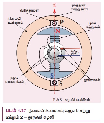சுற்று PQRS நிலையாகவும் மற்றும் தாளின் தளத்திற்கு குத்தாகவும் உள்ளது. புலச் சுற்றுகள் வழியே மின்னோட்டம் செலுத்தப்பட்டால், அதனைச் சுற்றி காந்தப்புலம் உருவாக்கப்படுகிறது. வெளிப்புற இயக்கியால் புலக்காந்தமானது வலஞ்சுழியாக சுழற்றப்படுவதாகக் கொள்க (படம் 4.28).