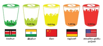 இந்தியாவில் ஒவ்வொருவரும் உருவாக்கும் கழிவுகளின் சராசரி அளவு 0.45 கிலோ கிராம். இது ஒப்பிடுகையில் குறைவான அளவாக இருந்தாலும், மக்கள் தொகை அதிகமுள்ள இந்திய நாட்டு மக்களினால் உருவாக்கப்படும் மொத்த கழிவுகளைக் கருத்தில் கொண்டால், அவற்றை எத்தனை வண்டிகளில் ஏற்ற வேண்டும்? வண்டிகள் வரிசையாக நிற்கும்
