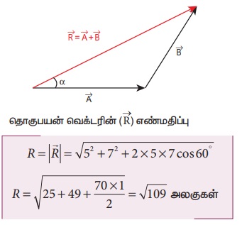 என்ற இரண்டு வெக்டர்கள் ஒன்றுக்கொன்று 60° கோணத்தில் சாய்ந்த நிலையில் உள்ளன. அவற்றின் எண்மதிப்புகள் முறையே 5 அலகுகள் மற்றும் 7 அலகுகள் ஆகும். தொகுபயன் வெக்டரின் எண்மதிப்பு மற்றும்