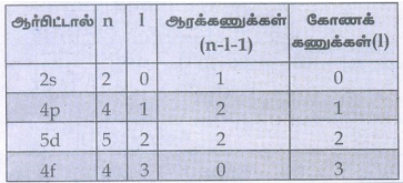 28. 2s, 4p, 5d மற்றும் 4f ஆர்பிட்டால்களுக்கு எத்தனை ஆரக் கணுக்கள் (radial node) காணப்படுகின்றன? எத்தனை கோணக் கணுக்கள் (angular nodes) காணப்படுகின்றன.