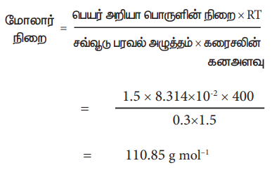 400K வெப்பநிலையில் 1.5 கிராம் நிறையுடைய பெயர் அறியா கரைபொருளானது, தகுந்த கரைப்பானில் கரைக்கப்படுகிறது. மேலும் இந்த கரைசலானது 1.5 லி க்கு நீர்க்கப்படுகிறது. இதன் சவ்வூடுபரவல் அழுத்தம் 0.3 bar என கண்டறியப்பட்டுள்ளது. அக்கரைபொருளின் மோலார் நிறையைக் கணக்கிடுக.