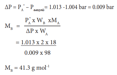 2% எளிதில் ஆவியாகாத கரைபொருளை கொண்டுள்ள நீர்க் கரைசலானது, கரைப்பானின் கொதிநிலையில், 1.004 bar அழுத்தத்தை கொண்டுள்ளது. PAo மதிப்பு 1.013 bar ஆக இருக்கும்போது கரைபொருளின் மோலார் நிறை என்ன?