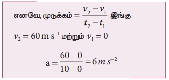 மேலும் துகள் 15 வினாடியிலிருந்து 30 வினாடி வரை மாறாத எதிர்க்குறி சாய்வினைக் கொண்டுள்ளது. இந்நிகழ்வில் v2 = 0 மற்றும் v1 = 60ms-1. எனவே t = 20 வினாடியில் முடுக்கமானது