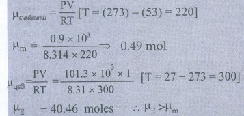 2. செவ்வாய்க்கோளின் சராசரி வெப்பநிலை கிட்டத்தட்ட -53•C மற்றும் அதன் வளிமண்டல அழுத்தம் 0.9 kPa எனில் செவ்வாய்கோளின் ஓரலகு பருமனில் உள்ள மூலக்கூறுகளின் எண்ணிக்கையை மோல்களில் கணக்கிடுக. புவியில் ஓரலகு பருமனில் உள்ள மோல்களின் எண்ணிக்கையுடன் ஒப்பிடுக.