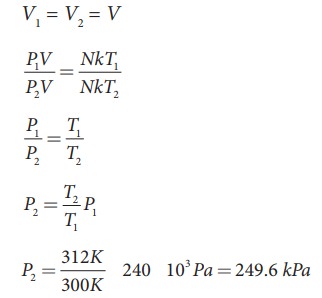 6. அதிகாலையில் சைக்கிளில் செல்லும் ஒருவர் 25°C வெப்ப நிலையில் சைக்கிளின் காற்றழுத்தத்தை 500 kPa என அளவிடுகிறார். பிற்பகலில் அவர் சைக்கிளின் காற்றழுத்தத்தை அளவிடும்போது அது 520 kPa ஆக உள்ளதெனில் பிற்பகலில் சைக்கிள் டயரின் வெப்பநிலை என்ன? (இங்கு டயரின் வெப்ப விரிவை புறக்கணிக்கவும்)