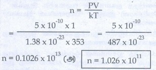 4. 80°C வெப்பநிலை மற்றும் 5 × 10-10 Nm-2 அழுத்தத்திலும் உள்ள வாயு ஒன்றின் ஓரலகு பருமனில் (1m3) உள்ள மூலக்கூறுகளின் எண்ணிக்கையைக் காண்க. (இங்கு போல்ஸ்ட்மென் மாறிலியின் மதிப்பு 1.38 × 10-23 JK-1).