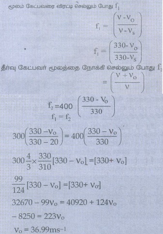 8. சைரன் வைக்கப்பட்ட காவல் வாகனத்தில் 20ms-1 திசைவேகத்தில் செல்லும் காவலர் (Police), voms-1 வேகத்தில் கார் ஒன்றில் தப்பிச் செல்லும் திருடனைத்துரத்திச் செல்கிறார். காவல் வாகன சைரன் அதிர்வெண் 300Hz, இருவரும் நிலையாக இருந்து 400Hz அதிர்வெண் உடைய ஒலியை உமிழும் சைரன் நோக்கிச் செல்கிறார்கள் எனில் திருடனின் திசைவேகத்தைக் காண்.