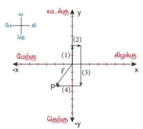 படத்தில் காட்டியுள்ளவாறு நேர்குறி x அச்சை கிழக்கு திசையாகவும், நேர்குறி y அச்சை வடக்கு திசையாகவும் கருதுக.