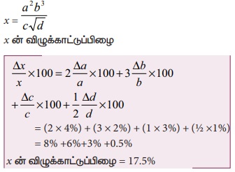 என்று கொடுக்கப்பட்டுள்ளது. a, b, c மற்றும் d ஐ அளவிடுதலில் ஏற்படும் விழுக்காட்டுப்பிழைகள் முறையே 4%, 2%, 3% மற்றும் 1% எனில் ன் விழுக்காட்டுப் பிழையைக் காண்க. (NEET 2013) தீர்வு