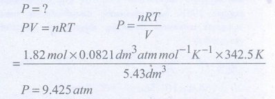 47) சல்பர் ஹெக்சாகுளோரைடு ஒரு நிறமற்ற மணமற்ற வாயு. அது நல்லியல்பு தன்மை உடையதாக கருதி 5.43 dm3 கனஅளவுள்ள ஒரு எஃகு கலனில் 69.5° Cல் 1.82 மோல் கொண்ட வாயுவின் அழுத்தத்தினைக் கணக்கிடுக.