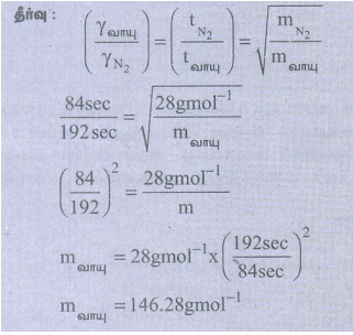 51) ஒரு வாயு 192 நொடியில் சுவரிலுள்ள ஒரு துளையின் வழியே விரவுகின்றது. N2 வாயு அதே வெப்ப அழுத்த நிலையில் விரவ எடுக்கும் நேரம் 84 நொடி எனில் வாயுவின் மோலார் நிறை என்ன?