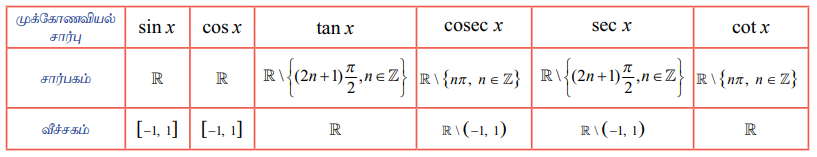 முக்கோணவியல் சார்புகளின் சார்பகங்கள் மற்றும் வீச்சகங்கள் பின்வரும் அட்டவணையில் கொடுக்கப்பட்டுள்ளன.