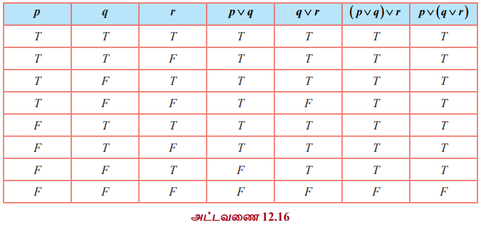 மெய்மை அட்டவணையில் ( p ∨ q ) ∨ r மற்றும் p ∨ ( q ∨ r ) ஆகியவற்றிற்கான நிரல்கள் ஒரே மாதிரியாக உள்ளன.