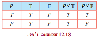 (i) மெய்மை அட்டவணையில் p ∨ T மற்றும் T ஆகியவற்றிற்கான நிரல்கள் ஒரேமாதிரியுள்ளதால் அவை இரண்டும் தர்க்க சமானமானவை. p ∨ F மற்றும் p ஆகியவற்றிற்கான நிரல்கள் ஒரே மாதிரியுள்ளதால் அவை இரண்டும்தர்க்க சமானமானவை.