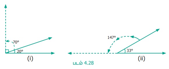 இரு கோணங்களின் கூட்டுத் தொகை 90° எனில், அவ்விரு கோணங்கள் ஒன்றுக்கொன்று நிரப்புக் கோணங்கள் (படம் 4.28 (i) ஐப் பார்க்க) ஆகும். அதுவே இரு கோணங்களின் கூட்டுத் தொகை 180° எனில், அவ்விரு கோணங்கள் ஒன்றுக்கொன்று மிகை நிரப்புக் கோணங்கள் (படம் 4.28 (ii) ஐ பார்க்க) ஆகும்.