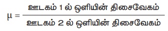 µ = ஊடகம் 1 ல் ஒளியின் திசைவேகம் / ஊடகம் 2 ல் ஒளியின் திசைவேகம்