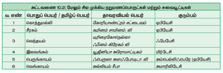 கீழ்க்கண்ட நறுமணப்பொருட்களையும், சுவையூட்டிகளையும் பற்றி விரிவாக விவாதிக்கலாம்.