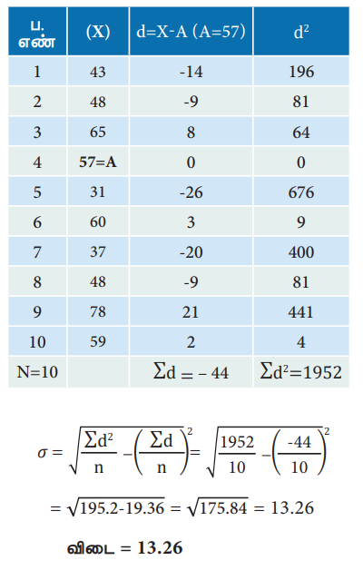உதாரணம் 2: பின்வரும் விவரங்களுக்கு அனுமானிக்கப்பட்ட சராசரியிலிருந்து திட்டவிலக்கத்தினை காண்க : 43, 48, 65, 57,31, 60, 37, 48, 78, 59.
