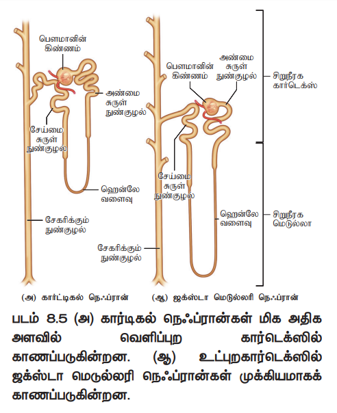 ஒவ்வொரு சிறுநீரகமும் சிக்கலான குழல்களைக் கொண்ட ஒரு மில்லியன் நெஃப்ரான்களால் ஆனது. நெஃப்ரான்கள் தான் சிறுநீரகத்தின் அமைப்பு மற்றும் செயல் அலகு ஆகும் (படம் 8.4).