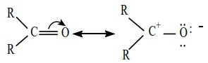 Sp2 இனக்கலப்படைந்த நிலையில் காணப்படுகிறது. மேலும், கார்பன் - ஆக்சிஜன் பிணைப்பானது, ஆல்கீன்களின் கார்பன் - கார்பன் இரட்டைப் பிணைப்பை ஒத்துள்ளது. கார்பனைல் கார்பனானது மூன்று Sp2 இனக்கலப்படைந்த ஆர்பிட்டால்களைப் பயன்படுத்தி மூன்று - பிணைப்புகளை உருவாக்குகிறது. ஆல்டிஹைடுகளில், ஆக்சிஜனுடன் ஒரு - பிணைப்பும் மேலும் ஹைட்ரஜன் மற்றும் கார்பனுடன் தலா ஒரு - பிணைப்பும் உருவாகிறது. கீட்டோன்களில் ஆக்சிஜனுடன் ஒரு 5 பிணைப்பும் மேலும் கார்பன்களுடன் மற்ற இரு - பிணைப்புகள் உருவாகின்றன. படம் 12.1 ல் காட்டியவாறு, மேற்குறிப்பிட்டுள்ள மூன்று . பிணைப்புகளும் ஒரே தளத்தில் அமைந்துள்ளன. கார்பனின் நான்காவது இணைத்திற எலக்ட்ரான் அதன் இனக்கலப்படையாத 2P ஆர்ப்பிட்டாலில் காணப்படுகிறது. இந்த ஆர்ப்பிட்டால் தளத்திற்கு செங்குத்தாக காணப்படுகிறது. மேலும், இது ஆக்சிஜனின் 2P ஆர்ப்பிட்டாலுடன் மேற்பொருந்தி ஒரு கார்பன் - ஆக்சிஜன் - உருவாக்குகிறது. ஆக்சிஜன் அணுவானது இரு பிணைப்பில் ஈடுபடா இரட்டை எலக்ட்ரான்களை கொண்டுள்ளது. இந்த எலக்ட்ரான்கள் அதன் மீதமுள்ள 2P ஆர்ப்பிட்டால்களின் இடம் பெறுகின்றன. இரண்டாவது அதிக எலக்ட்ரான் கவர் தன்மையுடைய தனிமமான ஆக்சிஜனானது, கார்பன் மற்றும் ஆக்சிஜனுக்கு இடையே பங்கிடப்பட்டுள்ள எலக்ட்ரான்களை தன்னை நோக்கி கவர்கிறது. எனவே, பிணைப்பானது முனைவு தன்மை பெறுகிறது. இம் முனைவு தன்மையானது ஆல்டிஹைடுகள் மற்றும் கீட்டோன்களில் வினைபுரியும் தன்மைக்கு காரணமாக அமைகின்றன.