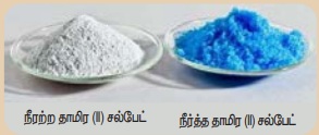 சிறிதளவு நீரற்ற தாமிர (II) சல்பேட் தூளை கண்ணாடித்தட்டில் எடுத்துக்கொண்டு அதனுடன் சிறிது சிறிதாக நீரைச் சேர்க்கவும். தூளின் நிறத்தில் மாற்றம் ஏற்படுவதைக் காண்கிறாயா? நிறமற்ற தூள் நீல நிறமாக மாறுவதை நீ காணலாம். இது நீரினைக் கண்டறிவதற்கான சோதனை ஆகும்.