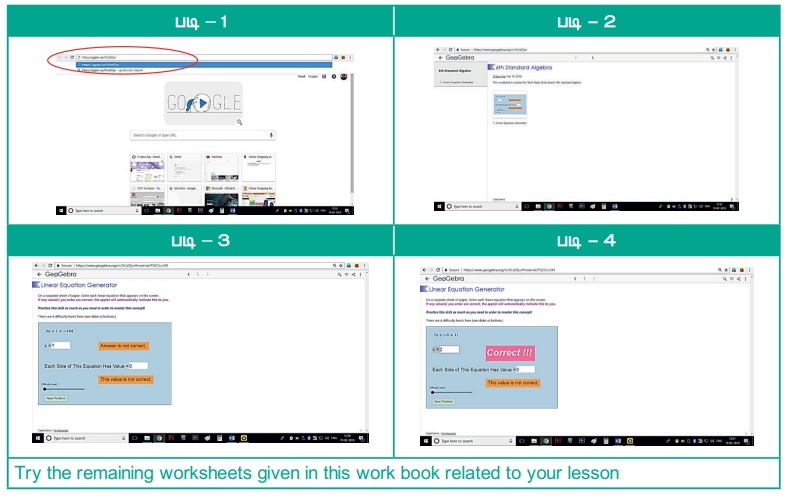 படி– 2 : கணித பயிற்சி புத்தகத்தில் "ஆறாம் வகுப்பு இயற்கணிதம் தோன்றும். இங்கே பற்பல பயிற்சி தாள்கள் இருப்பதைக் காணலாம். அங்கு உள்ள "Linear Equation Generator" என்ற பகுதியை திறக்கவும்.