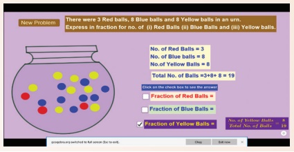 கீழ்க்காணும் உரலி/விரைவுக் குறியீட்டைப் பயன்படுத்தி Geo Gebra இணையப் பக்கத்தில் "Fraction Basic" எனும் பணித்தாளிற்குச் செல்லவும். 'New problem' ஐச் சொடுக்கிக் கணக்குகளுக்குத் தீர்வு காண்க.