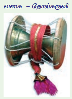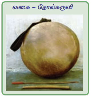 1. விலங்குகளின் தோலால் மூடப்பட்டுச் செய்யப்படும் கருவிகள் தோல்கருவிகள் எனப்படும். (எ.கா.) முழவு, முரசு
