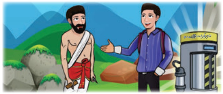 எழுதிக்கொண்டிருக்கிறார். அப்போது அவர்முன் சிறிய கால இயந்திரம் ஒன்று