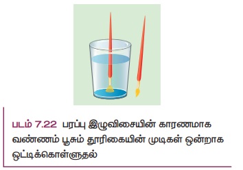 வண்ணம் பூசும் தூரிகையின் முடிகள் நீரிலிருந்து வெளியே எடுத்தால் ஒன்றாக ஒட்டிக்கொள்கின்றன. இதன் காரணம் அவற்றில் உருவான நீர் மெல்லேடுகள் ஒரு சிறும பரப்பிற்கு சுருங்க முனைவதாகும் (படம் 7.22).