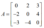 என்ற அணிக்கு AT = −A என்பதால், இவ்வணி ஓர் எதிர் சமச்சீர் அணியாகும்.
