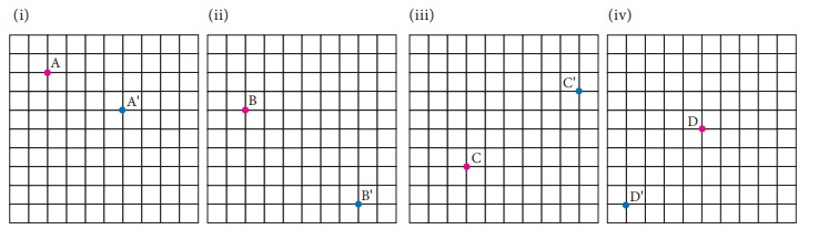 3. கீழ்கண்டவற்றில், முன்உரு A ஆனது நிழல்உரு A' ஆக எவ்வகையில் இடம்பெயர்வு செய்யப்பட்டுள்ளது?