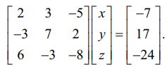 2x + 3y − 5z + 7 = 0, 7y + 2z − 3x = 17, 6x − 3y − 8z + 24 = 0 என்ற நேரியச் சமன்பாட்டுத் தொகுப்பின் அணி வடிவமானது