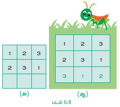 படம் 6.8 (அ) இல், 3 × 3 சுடோகுவில் முதல் இரண்டு கிடைமட்ட வரிசையை நிலையாக வைத்துக் கொண்டால், படம் 6.8 (ஆ) இல் காட்டியுள்ளவாறு, மூன்றாவது வரிசையை ஒரே ஒரு வழியில்தான் நிரப்ப இயலும்.