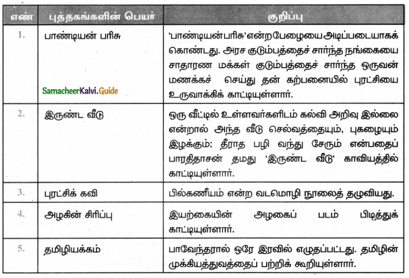 7. பாரதிதாசனின் படைப்புகளுள் எவையேனும் ஐந்து புத்தகங்களின் பெயர்களைப் பட்டியலிடுக.