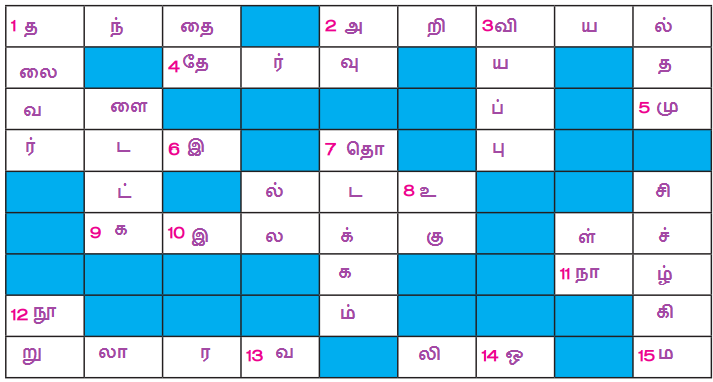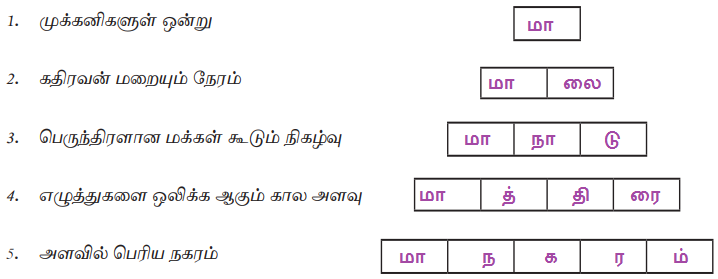குறிப்புகளைக் கொண்டு ‘மா' என்னும் எழுத்தில் தொடங்கும் சொற்களைக் கண்டறிந்து கட்டங்களை நிரப்புக.