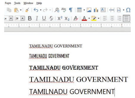 Format கருவிப்பட்டையில் உள்ள Font Size கிளிக் செய்து கீழ்தோன்றும் பட்டியலிலிருந்து, தேவையான அளவு ஒன்றை கிளிக் செய்யவும். தேர்ந்தெடுத்த எழுத்துருவின் அளவில் உரை மாறுகிறது.