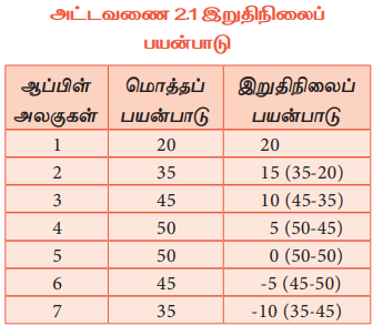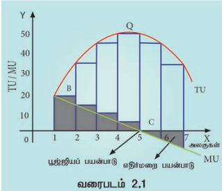 அட்டவணை 2.1ல் மொத்த பயன்பாடு உயர்ந்து செல்வதை நாம் பார்க்க முடிகிறது. மொத்த பயன்பாடு குறைந்து செல் விகிதத்தில் உயர்ந்து செல்வதைக் காணலாம். இறுதி நிலை பயன்பாடு பூஜ்ஜியமாக இருக்கும்போது மொத்த பயன்பாடு உச்ச நிலையை அடைகிறது. மேலும் இறுதி நிலை பயன்பாடு எதிர்மறையில் உள்ளபோது, மொத்த பயன்பாடு குறைகிறது.