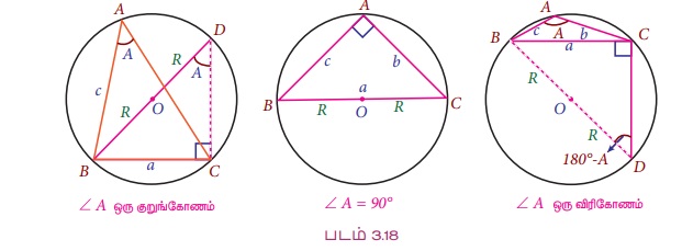 ∆ABC இல் A என்ற கோணம் குறுங்கோணமாகவோ அல்லது செங்கோணமாகவோ அல்லது விரிகோணமாகவோ இருக்கலாம். இங்கு O என்பது ∆ABC -இன் சுற்றுவட்ட மையம் எனவும் மற்றும் R என்பது ஆரம் எனவும் கொள்வோம்.