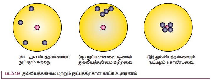 படம் 1.9 (ஆ), அனைத்து அம்புகளும் ஒரே இடத்திற்கு அருகில் பாய்ந்துள்ளன. ஆனால் மையப்புள்ளியை அடையவில்லை. எனவே அவை நுட்பமானவை ஆனால் துல்லியத்தன்மை அற்றவை . படம் 1.9 (இ), அனைத்து அம்புகளும் மையப்புள்ளிக்கு அருகில் பாய்ந்துள்ளன. எனவே அவை துல்லியத்தன்மையும் நுட்பமும் கொண்டவை.