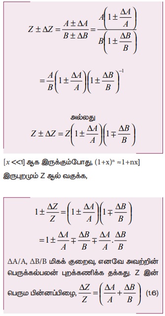 ΔA /A, ΔB / B ஆகியவை மிகக் குறைந்த அளவு எனவே அவற்றின் பெருக்கல் ΔA/A . ΔB/B புறக்கணிக்கப்படுகிறது. Z இன் பெரும் பின்னப் பிழை