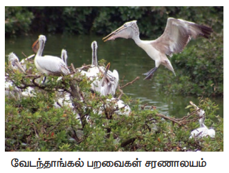 6. பறவைகள் சரணாலயம் - Bird sanctuary - an area of land in which birds are protected and encouraged to breed