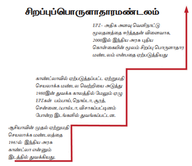 ஏற்றுமதி செயலாக்க மண்டல மாதிரிகளின் (Export Processing Zone - EPZ) பயன்பாட்டை உணர்ந்த நாடுகளில் முதன்மையானது இந்தியாவாகும். 1965 ஆம் ஆண்டில் காண்ட்லாவில் முதல் ஏற்றுமதி செயலாக்க மண்டலம் அமைக்கப்பட்டது. சிறப்புப் பொருளாதார மண்டலங்கள் பல மண்டலங்களை உள்ளடக்கியுள்ளன. எடுத்துக்காட்டாக, சுதந்திர வர்த்தக மண்டலங்கள், ஏற்றுமதி செயலாக்க மண்டலங்கள், தொழில் பூங்காங்கள், பொருளாதார மற்றும் தொழில் நுட்ப முன்னேற்ற மண்டலங்கள், உயிர் தொழில் நுட்ப மண்டலங்கள், அறிவியல் மற்றும் புதுமைப் பூங்காக்கள், இலவசத் துறைமுகங்கள், நிறுவன மண்டலங்கள் போல இன்னும் பல.