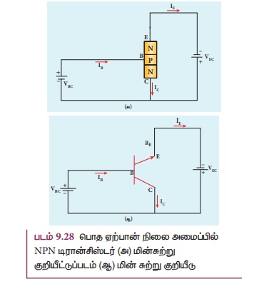 படம் 9.28 பொத ஏற்பான் நிலை அமைப்பில் NPN டிரான்சிஸ்டர் (அ) மின்சுற்று குறியீட்டுப்படம் (ஆ ) மின் சுற்று குறியீடு