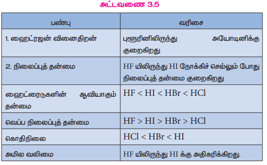 தயாரித்தல், பண்புகள் - ஹைட்ரஜன் ஹைலைடுகளின் இயற் மற்றும் வேதிப் பண்புகளில் காணப்படும் போக்கு | 12th Chemistry : UNIT 3 : p-Block Elements-II