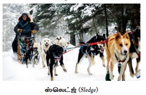 பனிச்சறுக்கு (Sledge) வாகனத்தைப் பயன்படுத்துகிறார்கள். இந்த வாகனம் இரண்டு அல்லது
