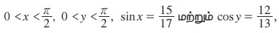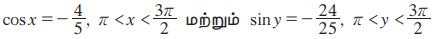 எடுத்துக்காட்டு 3.16 sin x = 4/5 (முதல் காற்பகுதியில் உள்ளது) மற்றும் cos y =-12/13, (இரண்டாம் காற்பகுதியில் உள்ளது) எனில்,