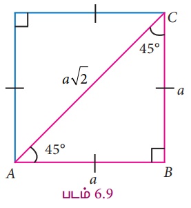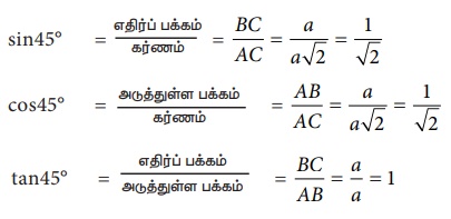 sin 45° = எதிர்ப்பக்கம் / கர்ணம் = BC/ AC = a / a√2