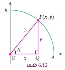 P(x,y) என்பது ஓரலகு வட்டத்தின் மீது முதற் காற்பகுதியில் உள்ள ஒரு புள்ளி எனில், ∠POQ = θ